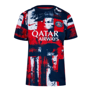 The 2024/25 PSG Pre-Match Special Jersey is a stunning representation of Paris Saint-Germain’s modern football culture, blending innovation with the club’s signature style. Designed to be worn by the players during their warm-up sessions before matches, this jersey features a dynamic graphic pattern inspired by the energy of Paris and the club’s bold identity. The lightweight, breathable fabric ensures maximum comfort, making it perfect for both casual wear and performance. Sporting the iconic PSG crest and a sleek, modern design, this jersey captures the essence of contemporary football fashion. Whether you’re a die-hard supporter or a collector, this pre-match special edition is a must-have for any PSG fan.