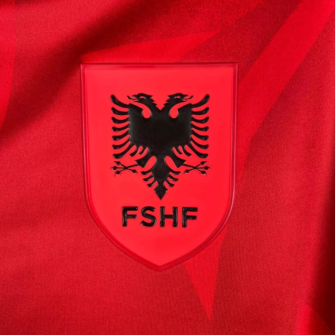The Albanian national crest proudly sits on the chest, symbolizing the team’s unity and national identity. Above it, the UEFA EURO 2024 logo is prominently displayed, signifying the prestigious tournament in which the team competes.