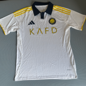Unveiling the Al Nassr 2025/26 Third Kit, also known as the Ronaldo Al Nassr white kit, this sleek jersey blends cutting-edge design with iconic heritage. Featuring a modern white base accented with royal gold and electric blue details, it symbolizes the elegance and ambition of Saudi Arabia’s top club. Inspired by Cristiano Ronaldo’s legacy and Al Nassr’s global influence, this kit is made for those who want to stand out and support greatness.