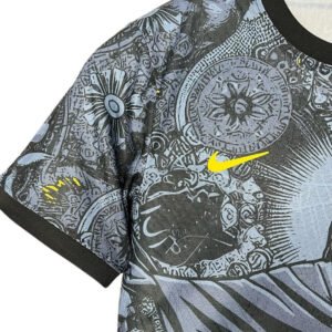 The Brazil special edition jersey by footjerseys.com pays homage to the country’s rich football history and cultural iconography. Drawing from the iconic 1994 and 1970 Brazil kits, the Redeemer jersey introduces a striking twist by featuring the image of Jesus Christ the Redeemer inside. Set against an updated blackout colorway, the jersey showcases an oversized, tonal depiction of “Christ the Redeemer” rising above a favela backdrop, evoking the spirit of Brazil’s diverse landscapes and heritage. Additional branding details on the sleeves and neck rib, along with a woven crest, add a finishing touch to this unique and visually captivating design.